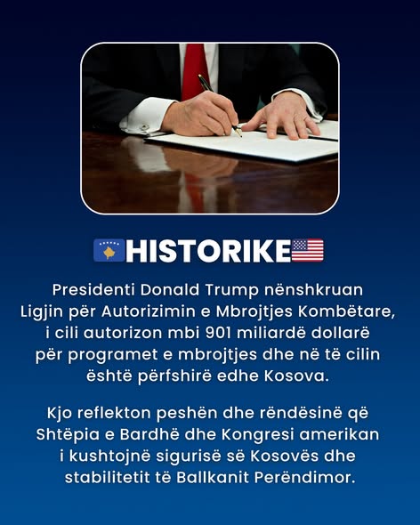 Presidenti Donald Trump nënshkruan Ligjin për Autorizimin e Mbrojtjes Kombëtare, i cili autorizon mbi 901 miliardë dollarë për programet e mbrojtjes dhe në të cilin është përfshirë edhe Kosova. Kjo reflekton peshën dhe rëndësinë që Shtëpia e Bardhë dhe Kongresi amerikan i kushtojnë sigurisë së Kosovës dhe stabilitetit të Ballkanit Perëndimor.